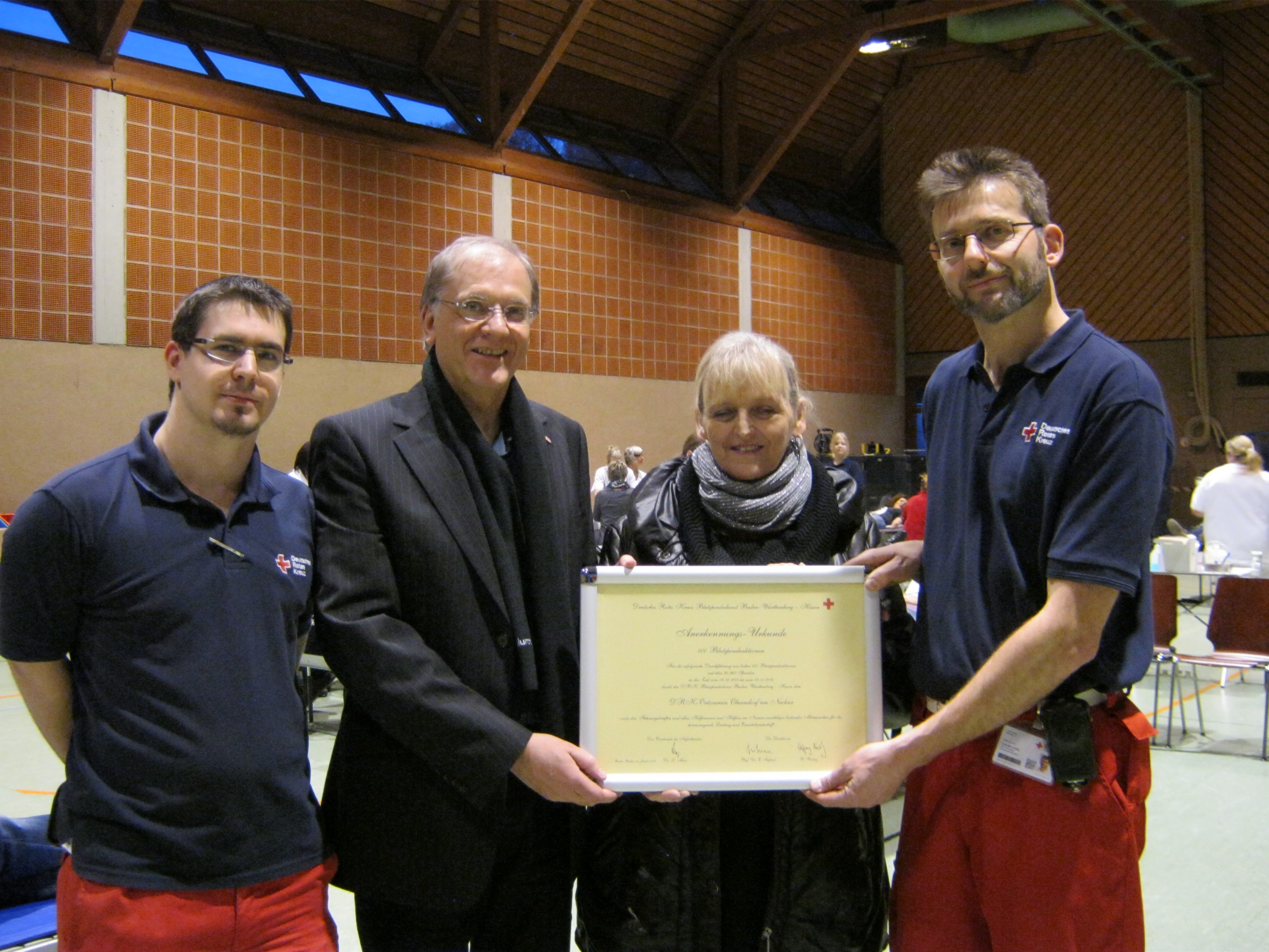Jeder Spender erhielt als kleines Dankeschön einen „Blutspendepiccolo“ und der DRK Ortsverein durfte aus den Händen von Herrn Eberhard O. Brachhold, Regionalleiter Baden des Blutspendedienstes, eine Urkunde verbunden mit dem Dank für diese Leistung entgegennehmen.